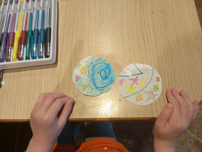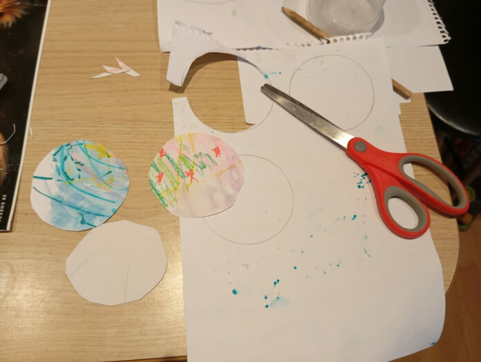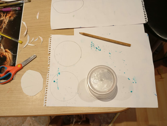 Tieši tāpat darām ar apgleznotajām lapām (ja tādas sagatavotas). No neapzīmētās puses uzvelkam apļus, izgriežam. Jo nejaušāk sakrīt gleznojumi un ķēpājumi uz izgrieztā apļa, jo interesantāk, tādēļ arī forši izmantot jau nokrāsotas lapas.