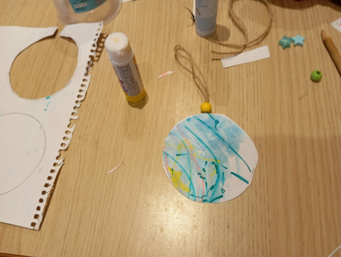 Uzlīmējam vienu krāsaino papīra bumbu kartona bumbai no vienas puses. Uz neaplīmētās puses uzliekam augšpusē aukliņas gabalu tā, lai virves galiņi satiktos uz kartona, un virs bumbas izveidotos cilpiņa. Nofiksējam auklas galus ar līmlentes gabaliņu pie kartona pamatnes (mums procesā beidzās līmlente un izlīdzējāmies ar parastu papīra strēmelīti un līmi).