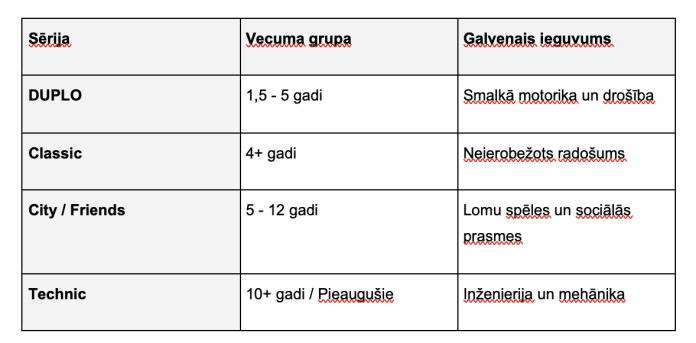 Tabula: LEGO sēriju salīdzinājums pēc vecuma