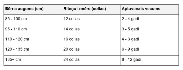 Lai atvieglotu izvēli, zemāk redzamā tabula parāda rekomendējamos velosipēdu izmēri attiecībā pret bērna augumu un aptuveno vecumu.