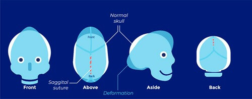- Sagitālā sinostoze (skafocefālija) ir visizplatītākais kraniosinostozes veids, kurā saaug kauli, kas veido galvas augšdaļu un sānus, un tai raksturīga gara un šaura galvas forma: