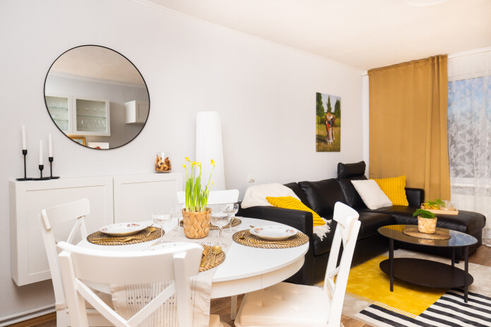 Interjera dizainere iesaka izvēlēties mazāk mēbeļu, taču atbilstošā izmērā, lai saglabātu plašuma sajūtu un nepārblīvētu telpu. Vairāki gaismas avoti – ne tikai griestu lampa – rada patīkamu atmosfēru un ļauj telpu ērti izmantot dažādos diennakts laikos.