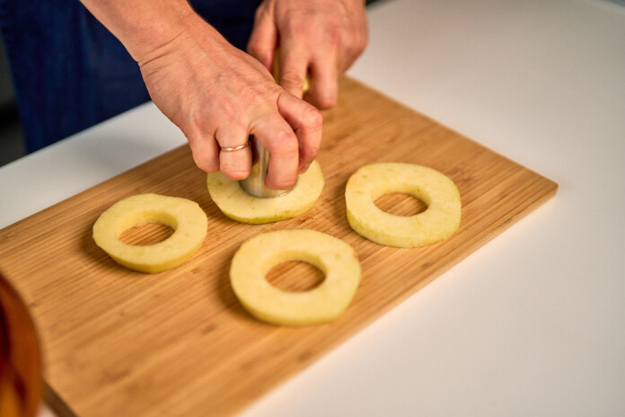 - Ābolu sagriež 1 cm biezās šķēlēs, nomizo un ar formiņu vai nazi izspiež serdi, lai veidotos gredzeni.