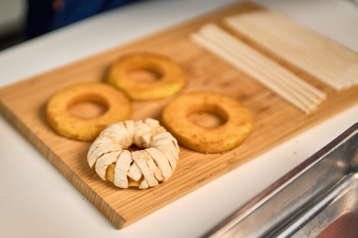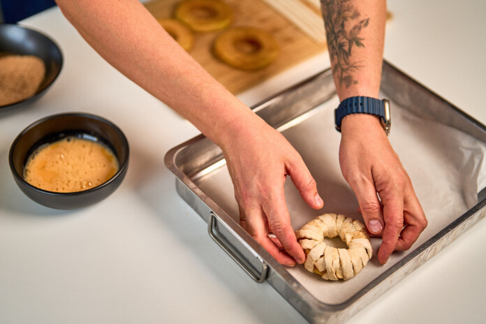 Cukuru sajauc ar kanēli un apviļā tajā ābolu gredzenus. Kārtaino rauga mīklu sagriež plānās strēmelēs un aptin ap katru ābolu gredzenu. Apsmērē ar sakultu olu un pārber ar nedaudz cukura.