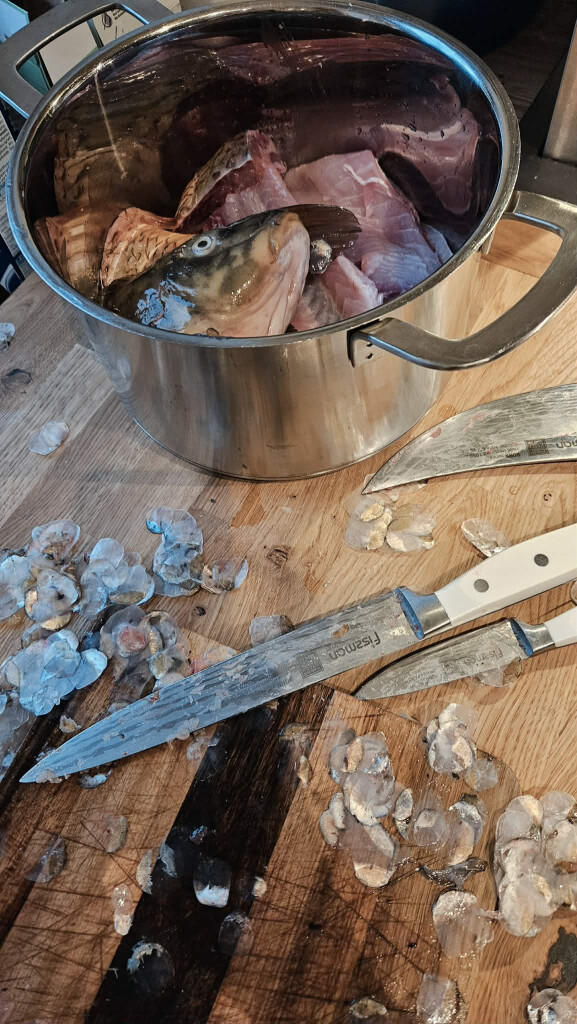 Taču atgriezīsimies virtuvē. Karpa ir gluma, tāpēc esmu iepraktizējusies to pirms tīrīšanas kārtīgi nomazgāt un apstrādes procesā pieturēt ar papīra dvieļiem. Būsim atklāti, nu jau karpas tīrīšana norit pavisam civilizēti, kopš lielveikalos pārdod jau iztīrītas zivis. Domājams, daudziem manas paaudzes cilvēkiem varētu būt trauma no dzīvām karpām, ko izvelk no baseina lielveikalā un tirgū, un tās vēl raustās konvulsijās, kad mēģini sākt uzšķērst tās vēderu. Pat pēc vairākām stundām, ko milzīgā polietilēna maisā zivs pavadījusi auto bagāžniekā. Joprojām šur un tur var manīt stāstus, kā karpa turēta vannā, lai uz gatavošanas brīdi būtu maksimāli svaiga, nereti pirms nokļūšanas uz svētku galda piedzīvojot amnestiju, jo ģimenes jaunākie locekļi to pieprasījuši.