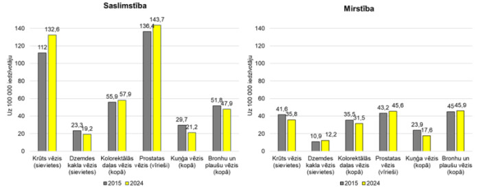 Saslimstība un mirstība ar noteiktām ļaundabīgo audzēju diagnozēm 2015. un 2024. gadā