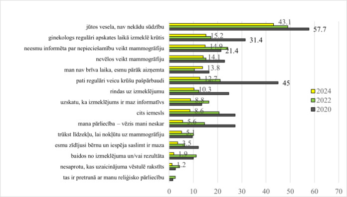 Jaunākie dati par krūts vēža skrīningu rāda būtiskas izmaiņas iedzīvotāju motivācijā un šķēršļos skrīninga neveikšanai. No 2020. līdz 2024. gadam būtiski samazinājušies psiholoģiskie un informatīvie šķēršļi krūts vēža skrīningā – arvien retāk sievietes norāda bailes no izmeklējuma vai rezultāta, pārliecību, ka vēzis viņas neskar, vai nesapratni par uzaicinājuma vēstuli. Samazinājušies arī praktiskie šķēršļi – rindas, līdzekļu trūkums un laika ierobežojumi.