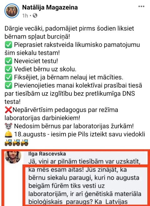 Šlesera partijas “Latvija pirmajā vietā” biedre Natālija Magazeina sociālajos tīklos uztraukti raksta: “Nedosim bērnus par laboratorijas žurkām!”. Vēl vienas populistiskas partijas – eiroskeptiķu Rīcības partijas – pārstāve Ilga Rascevska uztraucas: “…bērnu siekalu paraugi, kuri no augusta beigām fūrēm tiks vesti uz laboratorijām, ir arī ģenētiskā materiāla paraugs”. Antivakseru mītiņā Jēkabpilī viens no “neērtajiem jautājumiem” bija: “Kāpēc vajadzīgi siekalu testi? Tie taču satur mūsu DNS, kas ir konfidenciāla informācija”.