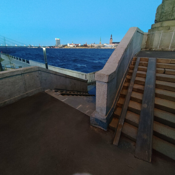 Jaunā centrālā promenādes vieta – skatu laukums Daugavā, kas simbolizē Gaismas pils atspulgu ūdenī.