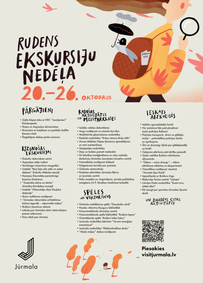 Šoruden Jūrmala aicinās doties pārgājienos un izzinošās pastaigās, kas vedīs gan pa Zaļās kāpas taku, gan Raiņa un Aspazijas vietām. Aktīvāku piedzīvojumu cienītāji varēs ar kajakiem izpētīt Ķemeru tīreli un piedalīties pankūku ballītē purva vidū.